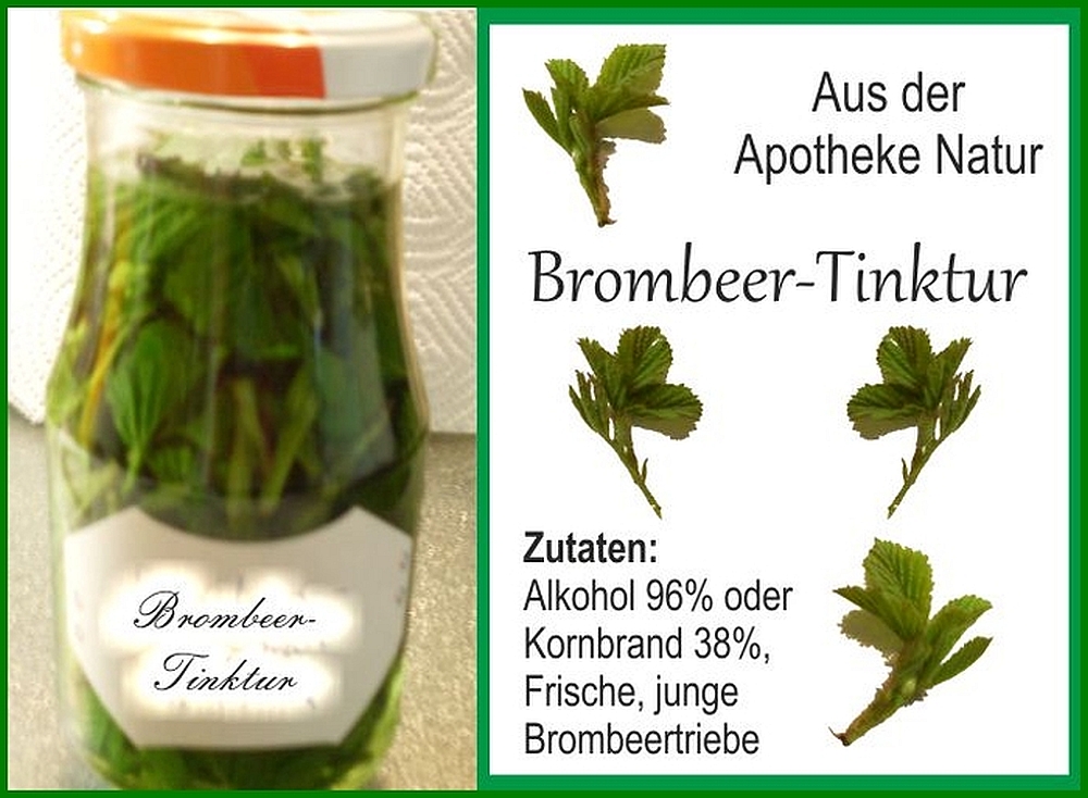 Frische junge Brombeertriebe waschen und in ein Glas oder eine Weithalsflasche füllen. Die Triebe mit mindestens 38% -igem Kornbrand oder Alkohol komplett bedecken. 3-5 Wochen ziehen lassen und täglich schütteln. Eine Woche ruhen lassen. Durch ein sauberes Leinentuch filtern und in eine möglichst dunkle Flasche abfüllen. | Täglich 10-30 Tropfen mit etwas Wasser verdünnt einnehmen. Äusserlich zur Behandlung von Ekzemen und Entzündungen der Haut verwendbar: