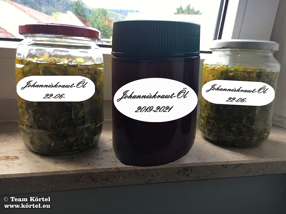 3 Hand voll, in der Sonne gepflückte, frisch gezupfte Blüten mit 1/2 l hochwertigem Pflanzenöl (vorzugsweise Oliven- oder Rapsöl) übergießen (Schraubgläser oder ähnliches bieten sich an). Die Blüten müssen gut bedeckt sein.